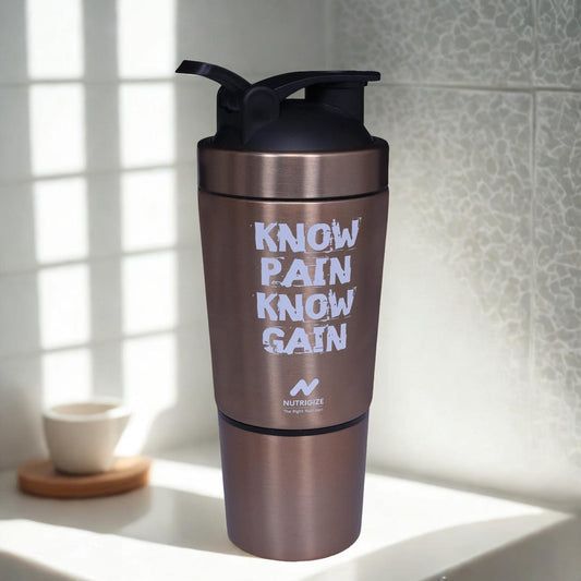 Nutrigize Stainless Steel Shaker Bottle, Protein Shaker with Extra Compartment for storage, 590 ml