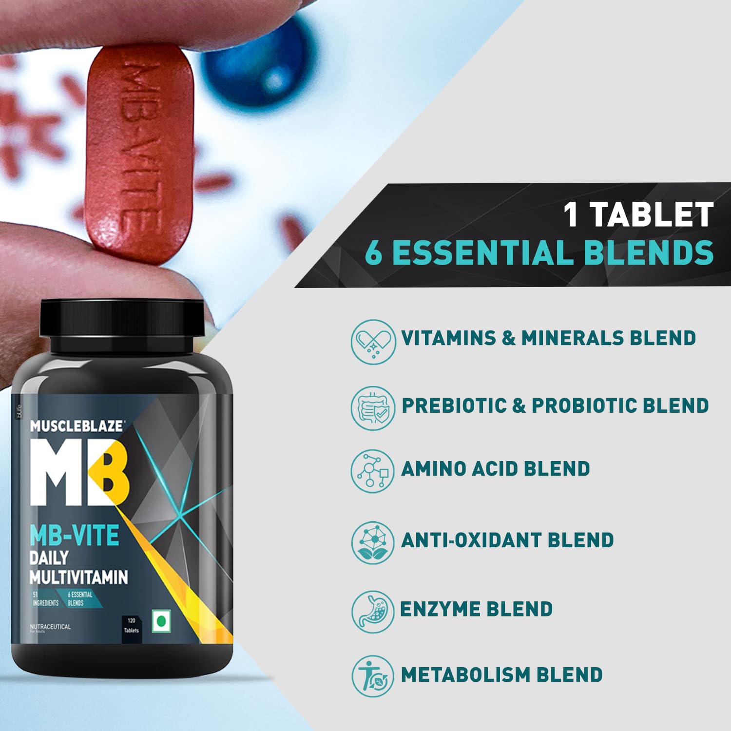 - MuscleBlaze MB-Vite Daily Multivitamin now has 6 powerful blends and 51 perfectly balanced ingredients. It enhances your lifestyle by upgrading your energy, strength, immunity, and recovery